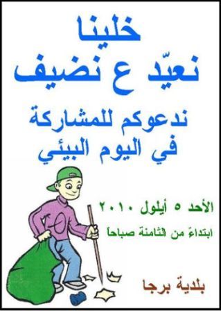 دعا المجلس البلدي في برجا الشوف الى أوسع مشاركة في حملة النظافة العامة في حارات برجا وأحيائها يوم الأحد 26 رمضان الموافق 5 أيلول 2010 … ” خلينا نعيّد ع نضيف ” هو شعار هذا اليوم البيئي الشامل . وقد دعت بلدية برجا الشوف الجمعيات الأهلية والروابط والأندية لإجتماع في السراي عند الساعة 30 : 5 من يوم الخميس 2 ايلول للاستعداد لليوم البيئي … التجمّع : الساعة الثامنة صباحاً في الأماكن الآتية : ساحة العين ، ساحة بيادر الروس ، النادي الثقافي ، التعمير ، المعبور ، عين الصغير .