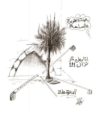 وكانت لجنة جامع برجا الكبير قد أحضرت ثلاث صنوبرات من الحجم المتوسط غرستها على الرصيف شمالي المبنى … في غمرة تلك الأشغال على ساحة العين تعددت الآراء وتضاربت بين رواد الساحة ، حيث أبدى كلٌ رأيه فيما يجب أن يكون عليه عرض الرصيف وطوله ، وأين يجب أن تزرع الشجرات الثلاث ، ومن قائل إن الرصيف سيعيق حركة المرور ، ومن قائل إنه لا ضرورة له ، وهكذا … الأمر الذي حدا بالمشرف على الورشة نبيل محمد يحي سعد نائب رئيس اللجنة على رسم هذا الكاركاتور : ” وصلت الصنوبرة الى ساحة العين ، اذا معك متر نزال ، الدعوة عامة ” .