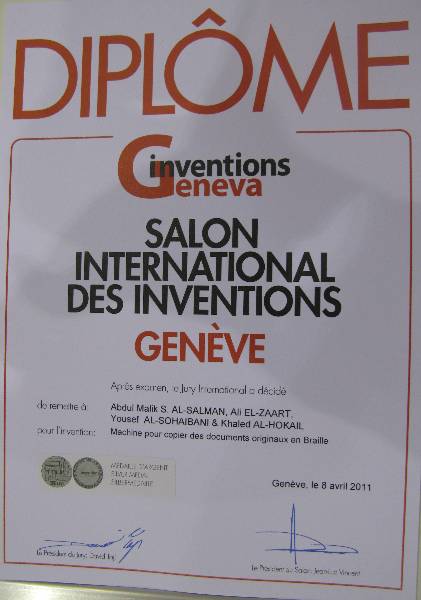 وقد حصل على الميدالية الفضية في معرض جينف للأبتكارات – سويسرا نيسان 2011 .