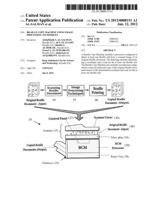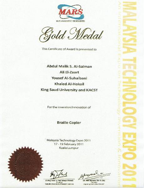 حاز البروفسور البرجاوي د . علي ياسين الزعرت من خلال فريق علمي من جامعة الملك سعود في المملكة العربية السعودية بابتكار آلة ناسخة لورق البرايل للمكفوفين ، على براءة اختراع نشرت على الإنترنت , وهو الإبتكار الذي احتضنته مدينة الملك عبد العزيز للعلوم والتقنية قبل أن يخرج إلى العالمية بحيازته الميدالية الذهبية في معرض ماليزيا للإبتكارات .