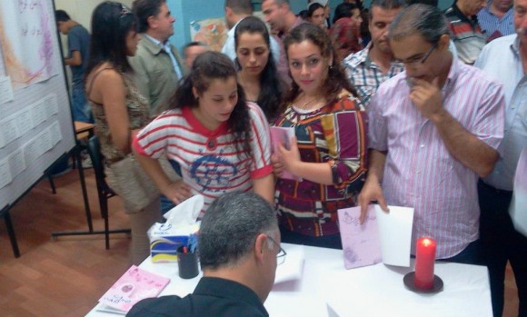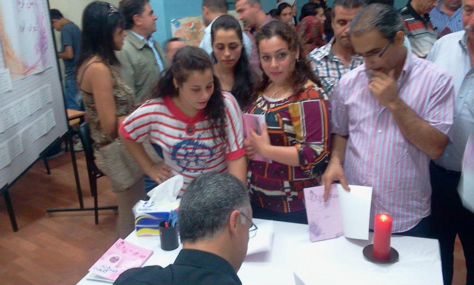بعدها أخذ الحاضرون الكتاب واحتشدوا أمام الشاعر يطلبون توقيعه .