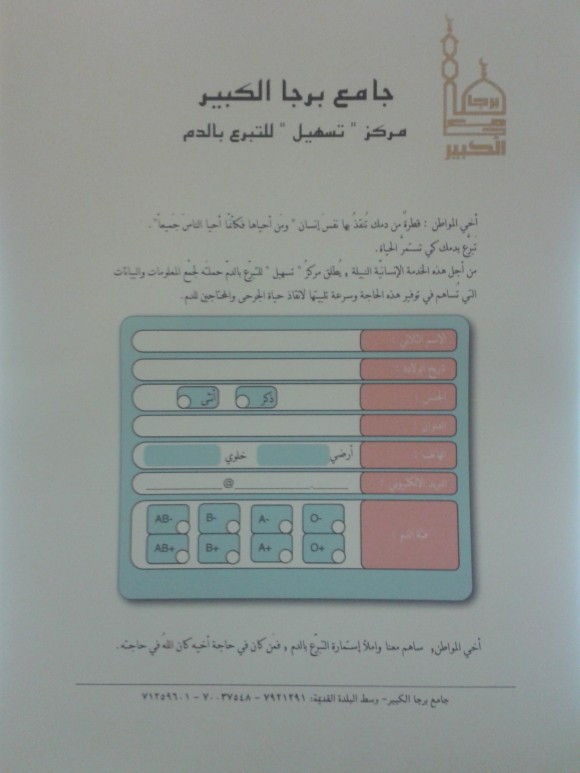 وقد جاء في المنشور : أخي المواطن … قطرةٌ من دمك تُنقذُ بها نفسَ إنسان ” ومَن أحياها فكأنّما أحيا الناسَ جَميعاً”.