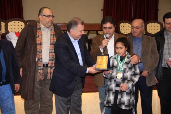 ثم سلم الوزير ترو درع النادي للطفلة آية حسن كحول( 9سنوات) الحائزة على بطولة لبنان ( الميدالية البرونزية والذهبية) في سباق 50 متر على الظهر للعام 2012 لعمر 8-9 سنوات.