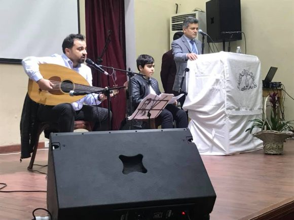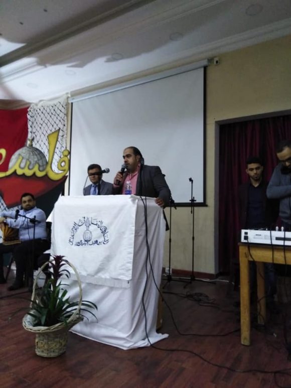 بعدها بدأت الأمسية بقصائد متنوعة للشاعر محمود درويش ألقاها الدكتور هيثم الغوش وغناها مع العزف على العود الدكتور فراس عبدالله وتخلل الأمسية إلقاء الطفل سعدالدين كحول لقصيدة “أبي”.