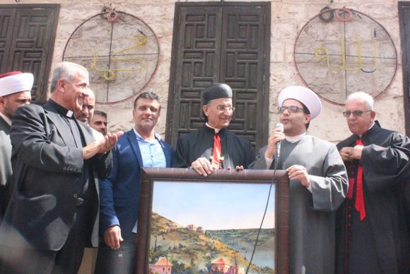 أول المستقبلين كان رئيس البلدية نشأت حمية وعدد من أعضاء المجلس البلدي وشق طريقه نحو مبنى الوقف الأثري حيث نُصب منبر على حائطه الغربي وسط ساحة العين، وقد تهافت الناس للسلام على غبطته والتقاط الصور التذكارية، التي امتلأت بها وسائل التواصل الإجتماعي وصفحات المواقع الإلكترونية.