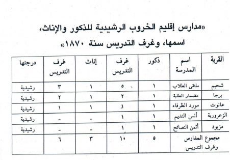 كان المسؤولون الرسميون وأهالي ناحية إقليم الخروب يولون المدارس الرسمية الرشيدية اهتماماً خاصاً ورعاية كاملة فقاموا بتأليف لجان أهلية لمساعدتها مادياً وتأهيل ابنيتها وتوسيعها. مع اهتمام المتصرف فرنكو باشا (1868 – 1873) بمدارس المعارف، ومع المساعي التي قام بها عمر أفندي الخطيب عضو مجلس إدارة متصرفية جبل لبنان، أنشئت عام 1869م. أربع مدارس حكومية رشيدية في قرى: برجا، الزعرورية، مزبود، وعانوت.