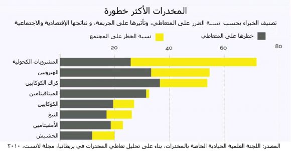 وفي دراسة أجريت في بريطانيا سنة 2010 تم تصنيفُ المشروبات الكحولية كأخطر مادة على المجتمع. أخطر من الكوكايين والهيرويين. وقد يستغرب البعض من ذلك، لكن الدراسة تأخذ بعين الإعتبار بأن الكحول مادة مشرّعة قانوناً، فهي شائعة وتباع في المحلات، في حين أن المواد الأخرى غير قانونية. يتوفى أكثر من 88 ألفاً في الولايات المتحدة كل سنة نتيجة أمراض الكبد والأمراض المرتبطة بشرب الكحول والتسمّم. وهؤلاء ليسوا من المفرطين في